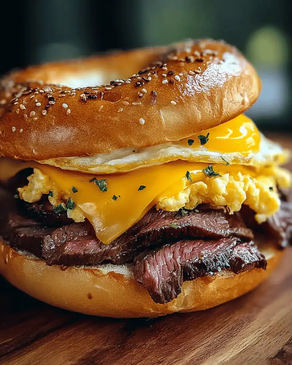 To create the ultimate Breakfast: Steak Egg and Cheese Bagel, focus on cooking your steak to the perfect doneness—aim for medium-rare for optimal juiciness. Use a non-stick pan to prevent sticking, and don’t shy away from adding that extra tablespoon of butter for richness. When scrambling the eggs, add a splash of milk for creaminess, and cook just until they’re fluffy but not dry. For an extra layer of flavor, consider toasting the bagel until it’s golden brown. The slight crunch will beautifully contrast the tender filling.